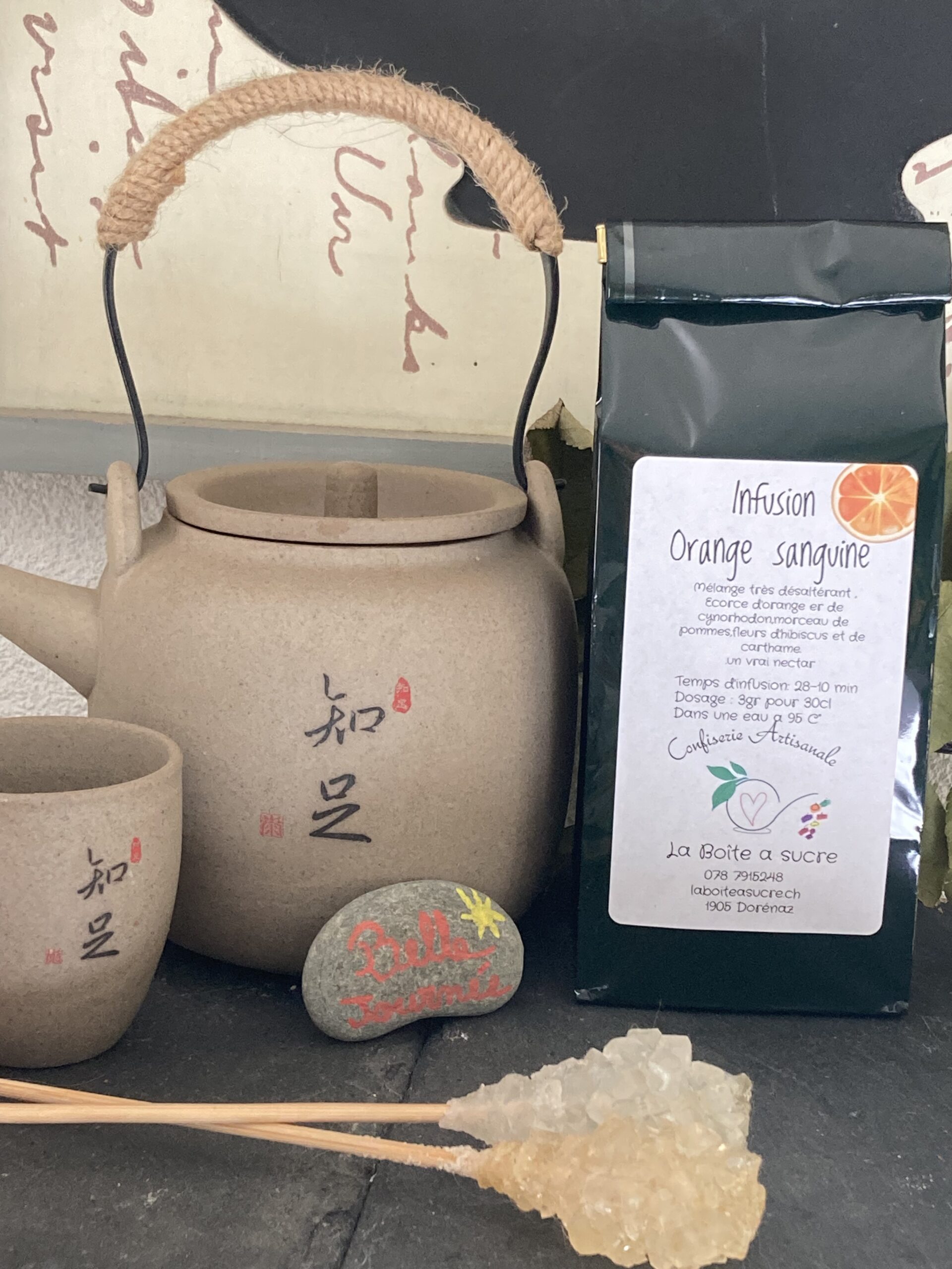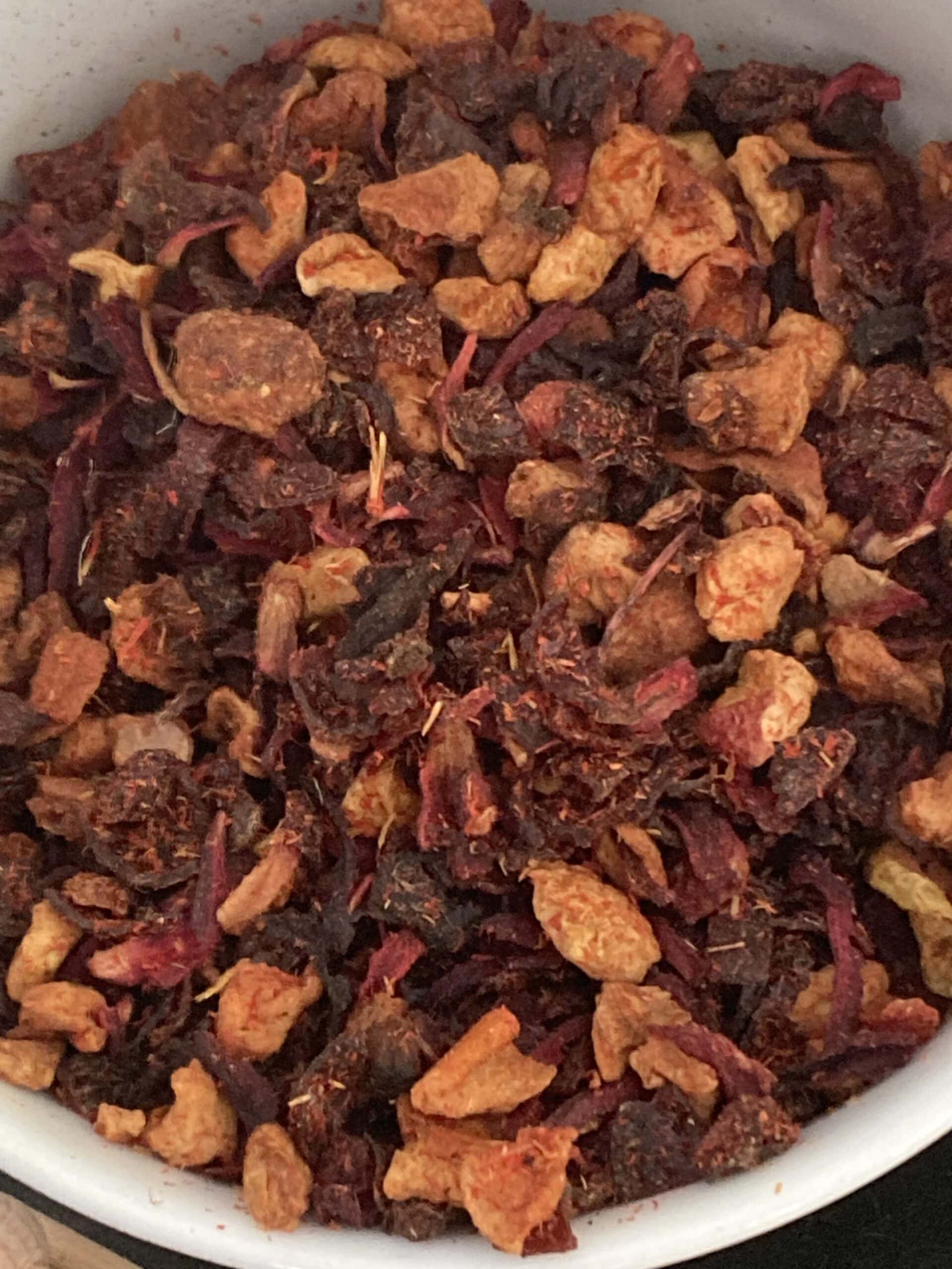Composition: écorce d’orange et de cynorhodon,morceaux de pommes séchées, fleurs d’hibiscus et de Carthage.